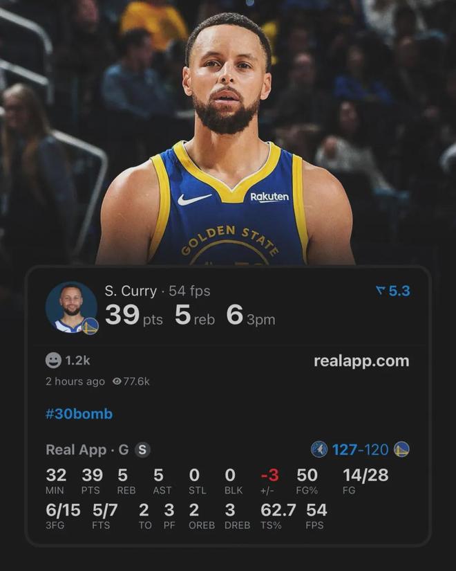 时隔五场比赛,库里重新披挂上阵,投篮28中14,其中三分15中6独揽39分5板5助,可惜难救主,勇士120-127不敌森林狼,战绩来到13胜13负排名西部第八。